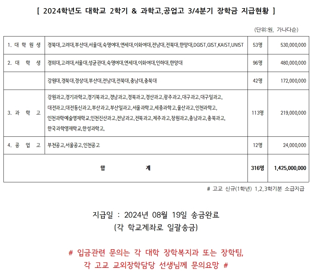 2024학년도 대학교 2학기 & 고교 3/4분기 장학금 지급현황
